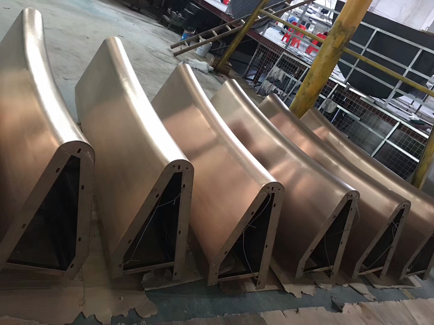 首先,根据图纸中蓝图的双曲线制作相应的模块,然后用到该模块敞开相应的铝材质,然后展开一系列的焊接,研磨,抛光,干净和上漆工艺,从而形成双曲线可以制成铝单板。